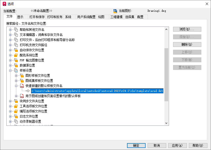 现在,已创建并保存了样板,即可开始使用它。默认情况下,开始绘制新图形时,AutoCAD 将根据在“QNEW 的默认样板文件名”(在此例中为“acad.dwt”)中指定的样板创建图形。让我们更改此设置,以使用新样板开始绘制新图形。