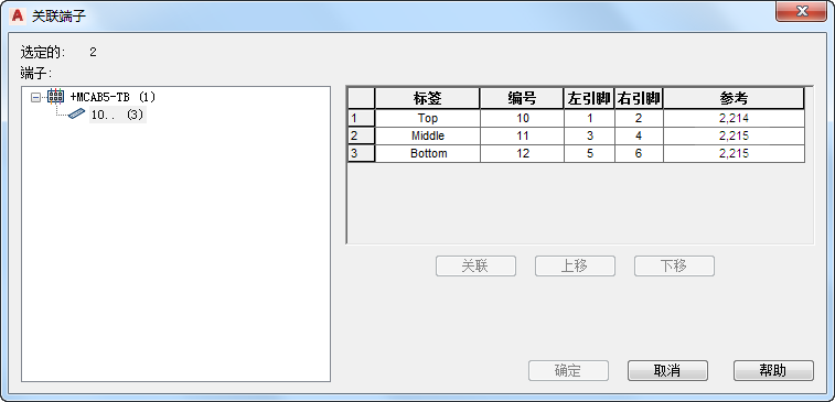 7. 在“关联端子”对话框中,选择端子 10, , (3),然后单击“关联”。