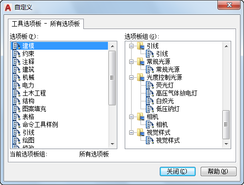“工具选项板”窗口仅显示当前组的工具选项板,或者如果没有当前组,则显示所有工具选项板。