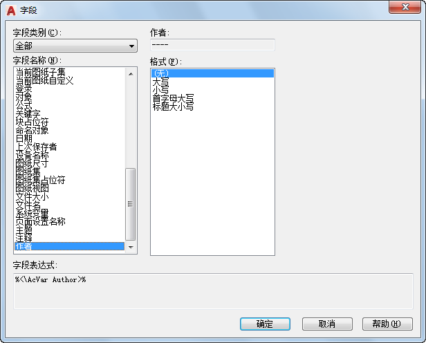 此项目的标签随字段名称的变化而变化。例如,从“字段名称”列表中选择“文件名”时,标签是“文件名”,值是当前图形文件的名称。对象字段的标签则是“特性”。例外情况:如果选择的是日期字段,则显示所选日期的格式,例如 M/d/yyyy。