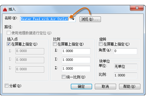 插入后,将在当前图形中存储块定义。此后,可以从“名称”下拉列表中选择它,而无需单击“浏览”按钮。