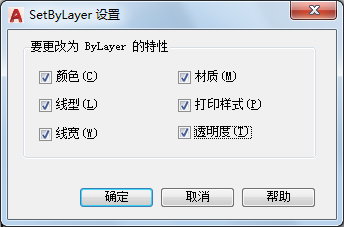 将选定对象的材质更改为“ByLayer”。(SETBYLAYERMODE=8)
