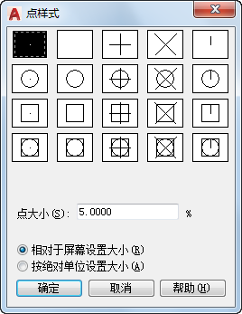 设定点的显示大小。可以相对于屏幕设定点的大小,也可以用绝对单位设定点的大小。点的显示大小存储在 PDSIZE 系统变量中。以后绘制的点对象将使用新值。