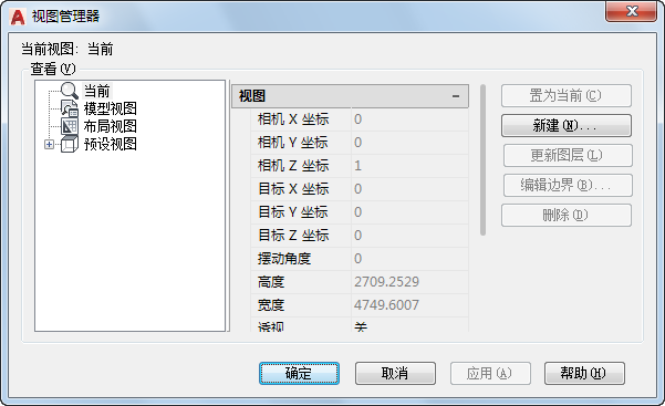 显示“新建视图/快照特性”对话框或“新建视图”对话框。