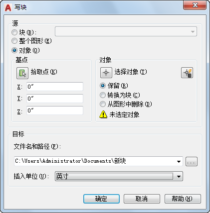 指定文件的新名称和新位置以及插入块时所用的测量单位。
