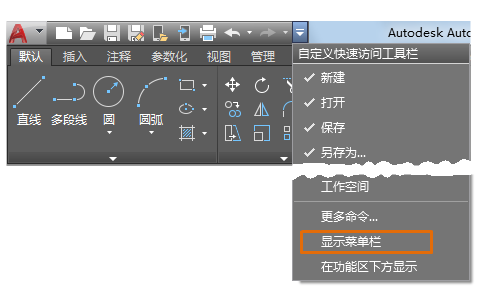 可以从“快速访问”工具栏下拉列表中或通过使用 CUI 来启用菜单栏,以自定义用户界面。