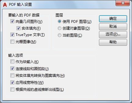 设置相关选项,以便从指定的 PDF 文件输入几何图形、填充、光栅图像和 TrueType 文字对象。