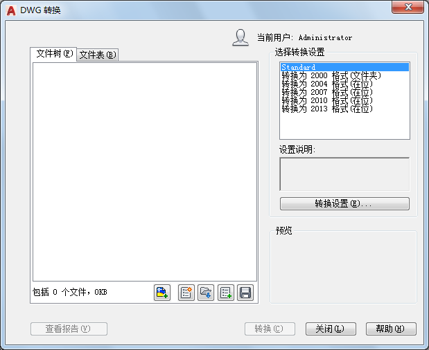显示选定用于转换的图形文件列表。其中包括图形名和路径、当前格式以及转换状态。可以通过单击“添加”按钮或拖动文件添加图形文件。还可以通过单击列标题排列图形的次序。