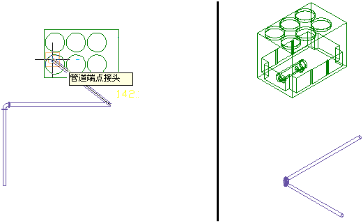 以下示例描述了如何利用布管解决方案将管道线连接到冷水机组。此管道线位于不同的标高且其末端不符合冷水机组连接。选择最后一个管段,然后在末端开放对象上单击
