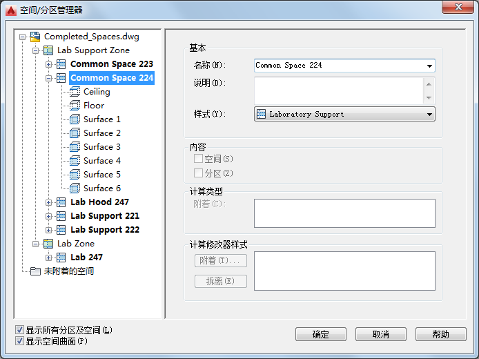 可使用“空间/分区管理器”查看分区层次结构以及空间信息,例如曲面和洞口类型。