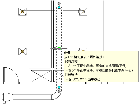 如果对象已连接到系统,可以在当前 XY 平面中移动已连接的对象以保持连接。下图说明了如何使用位置夹点移动风管对象。
