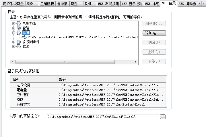 | 对目录重新排序 | 选择目录,然后根据需要单击“上移”或“下移”。 在“MEP 目录”选项卡上列出的目录顺序,也是在布局过程中选择零件时列出的目录顺序。 |