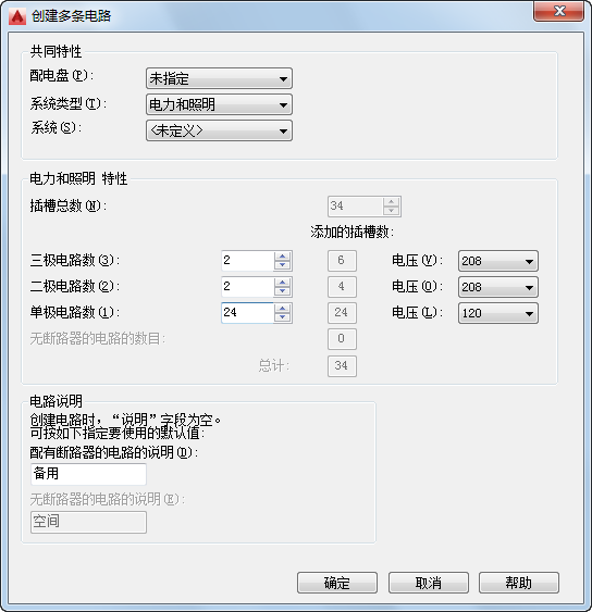 - 配电盘:如果在开始执行此命令之前已选择了配电盘名称,此字段将处于非激活状态。如果选择了“<未指定>”,请从下拉列表中选择配电盘。如果不希望将回路指定给配电盘,请在此列表中选择“<未指定>”。