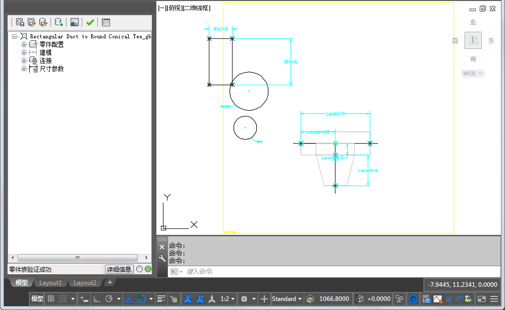 选择创建或修改参数化零件时,构件编辑器使用参数化构建环境。以下示例中的构件编辑器显示了矩形风管到圆锥形接头 T 形三通的连接。有关详细信息,请参见“启动构件编辑器”。