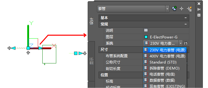 对于套管,在“特性”选项板上的“常规”下,从列表中指定系统。