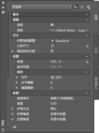 “特性”选项板的“设计”选项卡上的特性,这些特性用于添加管道对象。