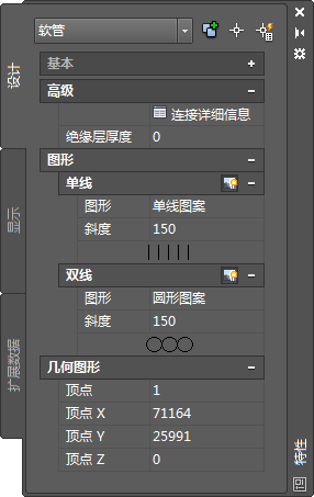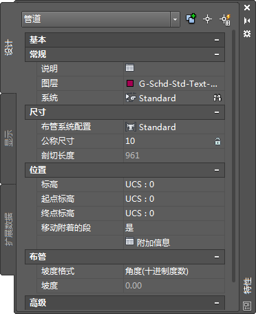 本部分在“特性”选项板的“设计”选项卡上定义用于修改管道系统的特性。“设计”选项卡分成二个部分:基本和高级。