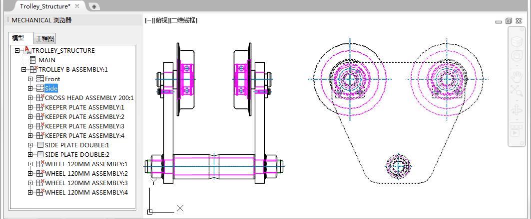 在此示例中,部件 TROLLEY 有两个在模型空间和 Mechanical 浏览器中显示的视图。在 Mechanical 浏览器中选定的视图将在模型空间中亮显。