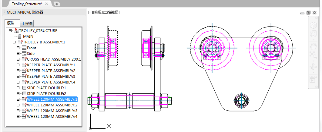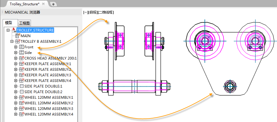 每个零部件都至少有一个零部件视图。在此示例中,零部件 TROLLEY B ASSEMBLY 有两个零部件视图。