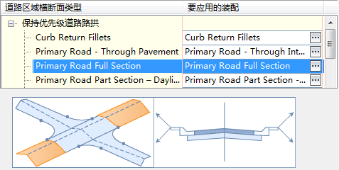例如,当您在交点编辑对话框中选择“主要道路全横断面”道路区域时,将显示以下概念图,以指示该区域在道路上的位置。