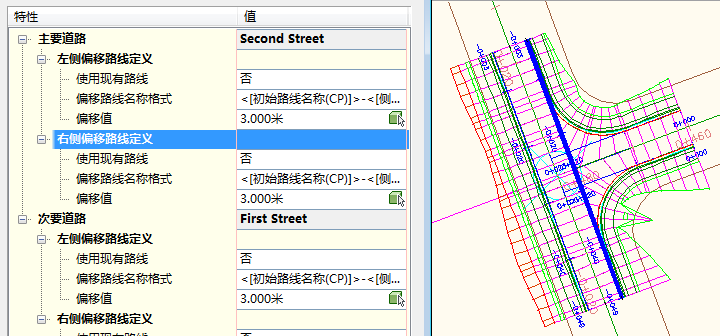 名为“First Street”的右侧偏移路线是在“交点偏移参数”对话框中选择的,显示在左侧。在图形中,该偏移路线将亮显。