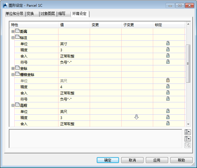 在“环境设定”选项卡上,在为图形中的一个或多个要素(对象)更改过的任何设置所对应的“子变更”列中,您会看到一个箭头。您可以通过单击该箭头取消替代,并可以锁定任何设置以防止在要素级别的替代。