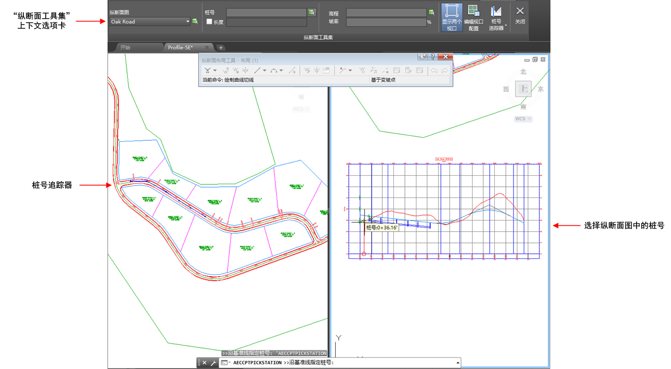 当您运行命令时,可以在“透明命令”功能区选项卡上选择“纵断面工具集”命令,以显示“纵断面工具集”上下文功能区选项卡。