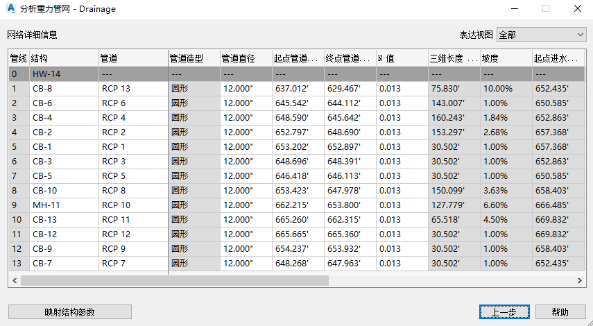 您可以单击“映射结构参数”按钮打开映射排水结构参数对话框。您可以使用“映射排水结构参数”对话框将零件生成器零件的参数映射到“分析重力管网”命令所需的参数。