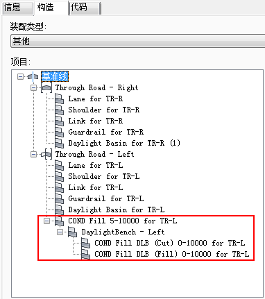 - 在“项目”列表中,选择位于装配左侧的条件部件。再次单击以亮显文字。更改名称,以使其指示根据设置要检测的条件类型。在以下示例中,第一个条件部件的名称已更改为 COND Fill 0-5 for TR-L。在此示例中,COND 指示了部件为条件部件。Fill 指示了激活部件的条件类型。0-5 指示了部件期望的填方条件的最小距离值和最大距离值。在此示例中,TR-L 是对与此特定部件相关联的上级装配的名称的引用(在此例中为“Through Road”或“TR”和“Left side”或“L”)。