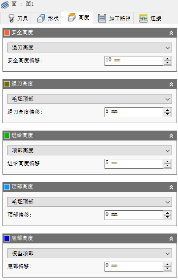 “退刀高度”用于设置在进入下一个切削加工路径之前刀具向上移动的高度。“退刀高度”应设置为高于“进给高度”和“顶部高度”。“退刀高度”与后续偏移一起使用来确立高度。