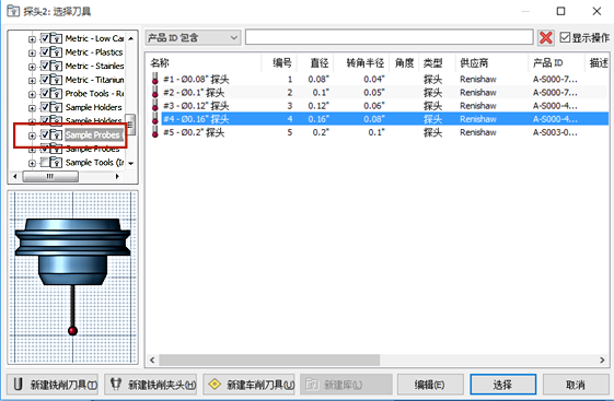 在“刀具”选项卡上,按“刀具”按钮并向下滚动到“样例探头”库以选择探头。