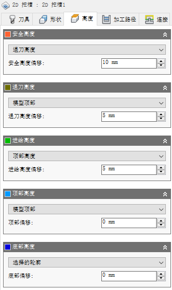 “退刀高度”用于设置在进入下一个切削加工路径之前刀具向上移动的高度。“退刀高度”应设置为高于“进给高度”和“顶部高度”。“退刀高度”与后续偏移一起使用来确立高度。