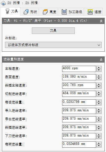 该值应始终小于螺旋斜插直径,以便系统能够计算出与可用的挖槽或通道匹配的范围。较小的直径会降低排屑能力,造成机床跳动,并会导致刀具断裂。