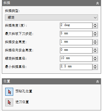指定在斜插型面上每转的最大下刀步距。该参数允许在斜插过程中执行全宽度切削时限制刀具负载。