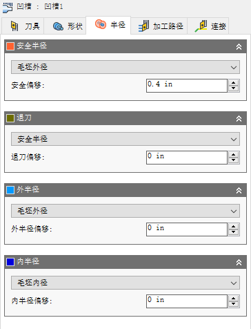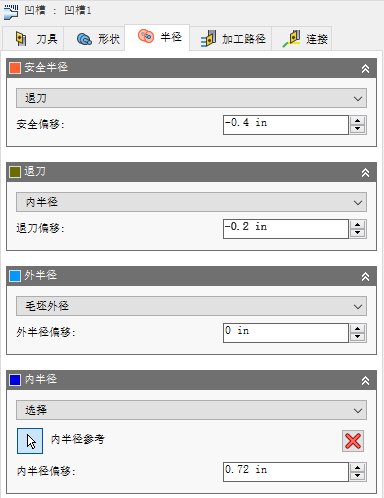 显示为深蓝色,它用于定义切削区域的最小径向边界。对于外侧(外径)加工,内半径用于控制切削区域的最大深度。对于内侧(内径)加工,内半径用于定义您计划要加工的内部毛坯曲面。