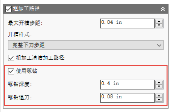 “使用啄钻”可跨切削方向的长度创建多个步进。在“啄钻深度”之间,刀具会沿其路径按指定的“啄钻退刀”距离进行退刀。如果材料会产生一长串切屑,请使用此选项。