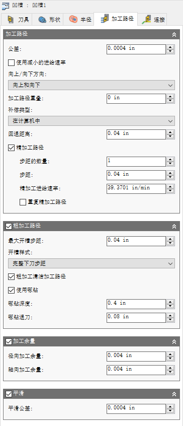 也称为“切削公差”,此公差用于刀具路径生成和几何三角剖分。任何其他过滤公差(如“平滑”)必须与此公差相加,才能获得切削的总公差。