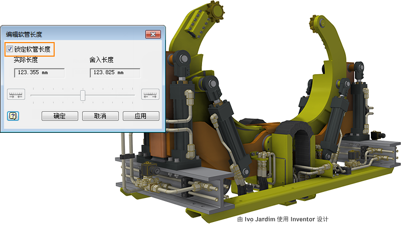 新选项“锁定软管长度”可以计算软管长度的精确总和。选择该选项后,如果零部件移动或偏移,该选项可禁止软管长度因自适应而更改。