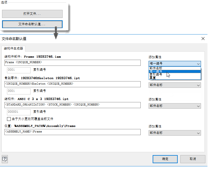 在“文件命名默认值”对话框中,单击“添加属性”下拉列表以配置您的命名方案。