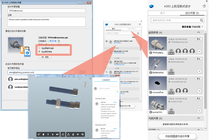 在 Inventor 2016 R3 中添加了设计共享功能,以便于您的团队以及其他项目协作者可在任何位置通过任何设备进行设计审查。Inventor 2017 中的一些增强功能实现更快、更轻松的协作。现在可以在 Inventor 中直接查看和管理协作者和反馈。新的控件使您不仅可以共享模型图形,还可以共享零件特性和零件名称,从而进行更加详细的审查。