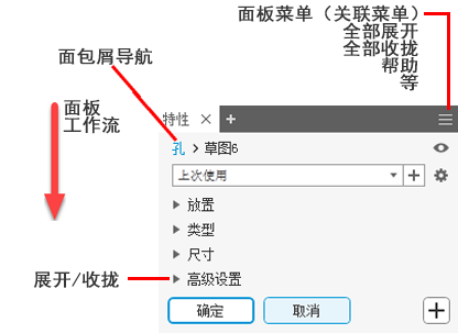 特性面板支持上下文访问用于创建和编辑特征的参数。