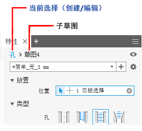 单击面包屑导航文本时,特性面板显示将会更新以显示选定项目的适当信息。 例如,当编辑孔特征时,单击“草图”面包屑导航时将应用尚未保存的任何孔特征参数更改,并进入“编辑草图”模式。