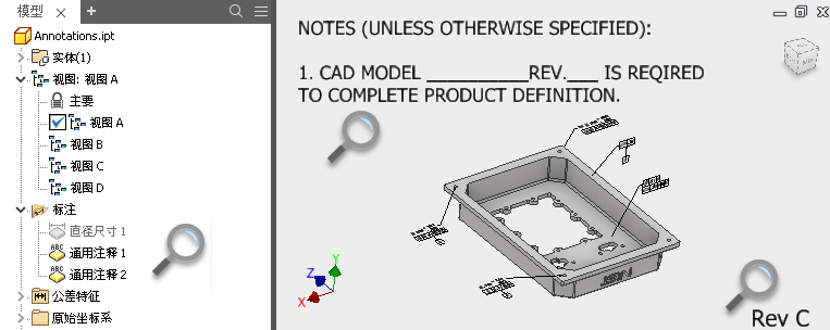 - 激活视图 B、C 和 D,并关闭通用注释 1 和 2 的可见性。