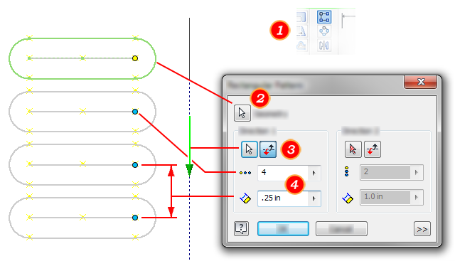 - 在“矩形阵列”对话框中,单击“方向 1”下的选择工具,然后选择几何图元以定义阵列的第一个方向。