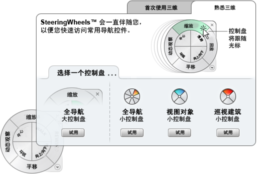 SteeringWheels 也称为控制盘,是一些跟踪菜单(跟随光标)。它们将许多常用导航工具组合到一个界面中。