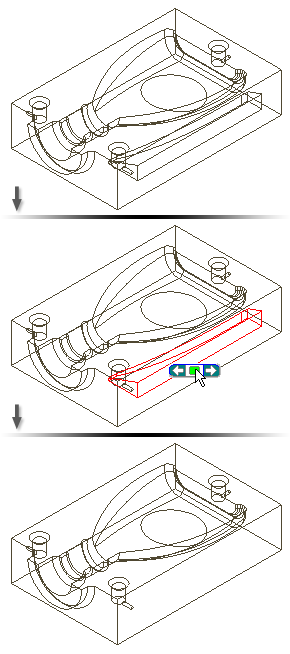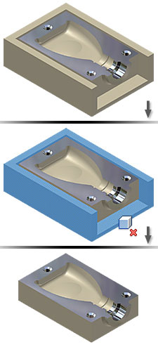 删除体块,如定义模型基础的结果。体块是一组可能包含或不包含中空体的面。零件或曲面体应至少具有一个体块。为模型形状造型、从基础中删除零件时,体块保留了下来。使用“删除面”从空腔中删除体块。
