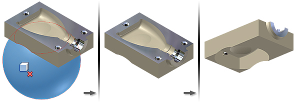 删除中空体以将质量恢复到模型。中空体是一组定义了内部中空空间的面。某些造型操作(例如不删除面的抽壳)在模型中创建一个以后需要删除的空洞。由于中空体隐藏在模型内部,因此可以使用“选择其他”方法循环选择来亮显要删除的中空体。