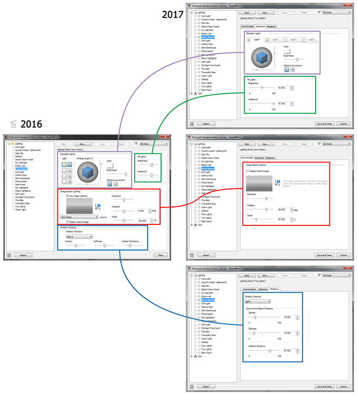 “阴影设置”在每种“光源样式”中单独管理。这些设置位于“样式编辑器”用户界面的“阴影”选项卡上。新的“环境”选项使用环境图像来定义阴影方向。