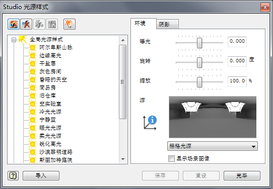 “光源样式”菜单中添加了 11 种全新的光源样式。其中包括“昏暗的天空”、“灰色的房间”、“无边际泳池”、“照相亭”、“宁静蓝”、“锐化高光”、“边缘高光”、“冷光灯”、“暖光灯”、“柔光灯”和“格栅灯”。