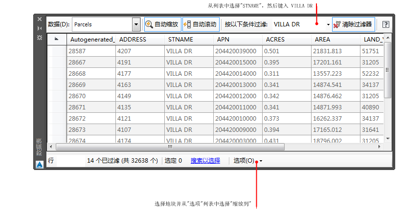 显示任何图层的数据表。过滤数据表以显示地块子集 - 在本例中,仅为 Villa Drive 上的地块。